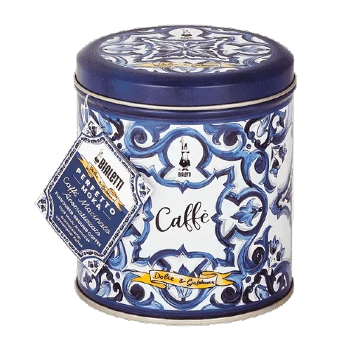 Bialetti Perfetto Moka Autentico x Dolce&Gabbana Ground Coffee & Tin Mediterranean – The precious blend of 80% arabica and 20% robust, makes Perfetto Moka Autentico a coffee with an intense and inebriating flavor, where elegant fruit notes meet tasty caramel ones for an unmistakable aroma.
