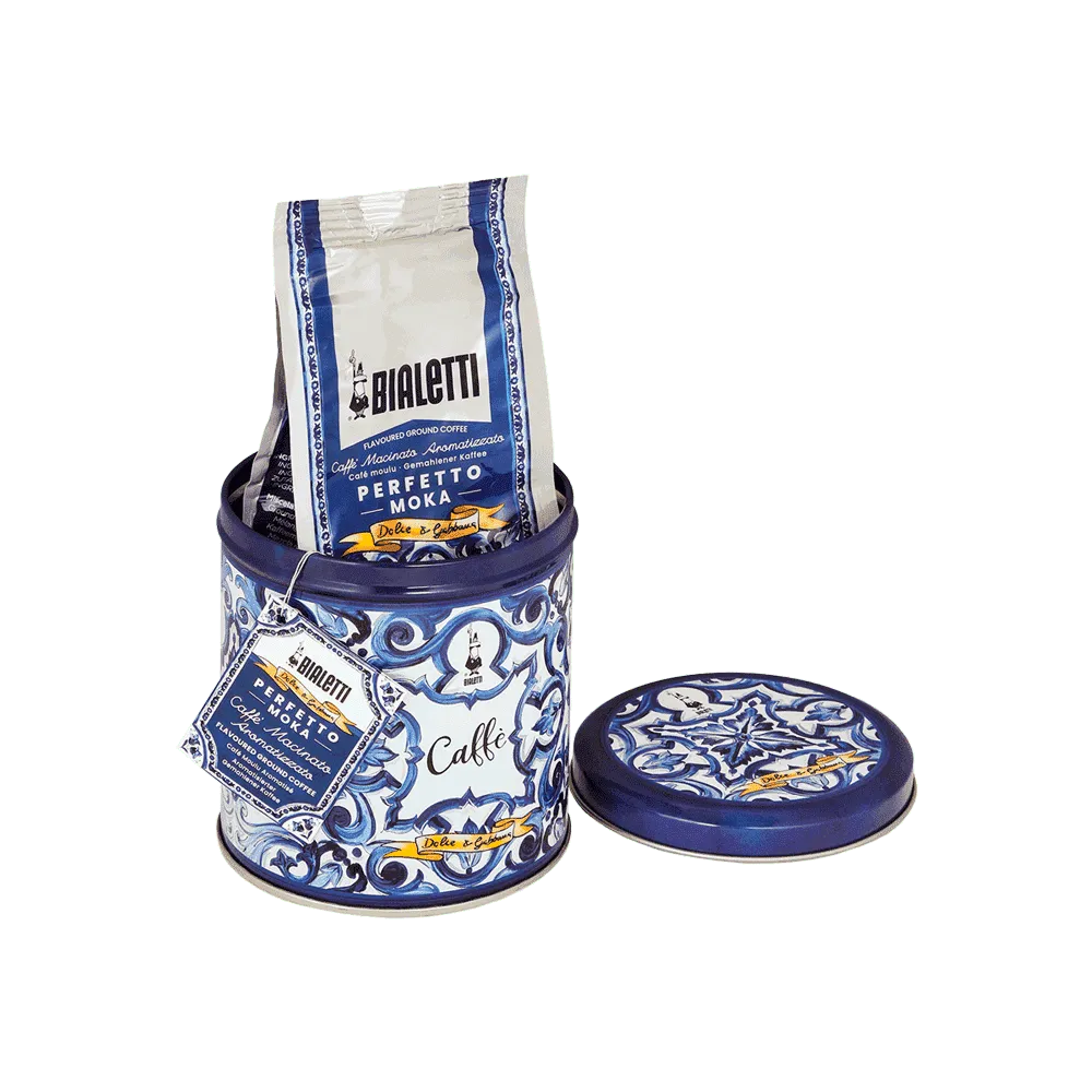 Bialetti Perfetto Moka Autentico x Dolce&Gabbana Ground Coffee & Tin Mediterranean – Two Italian icons collaborating to celebrate the ritual of Italian coffee.