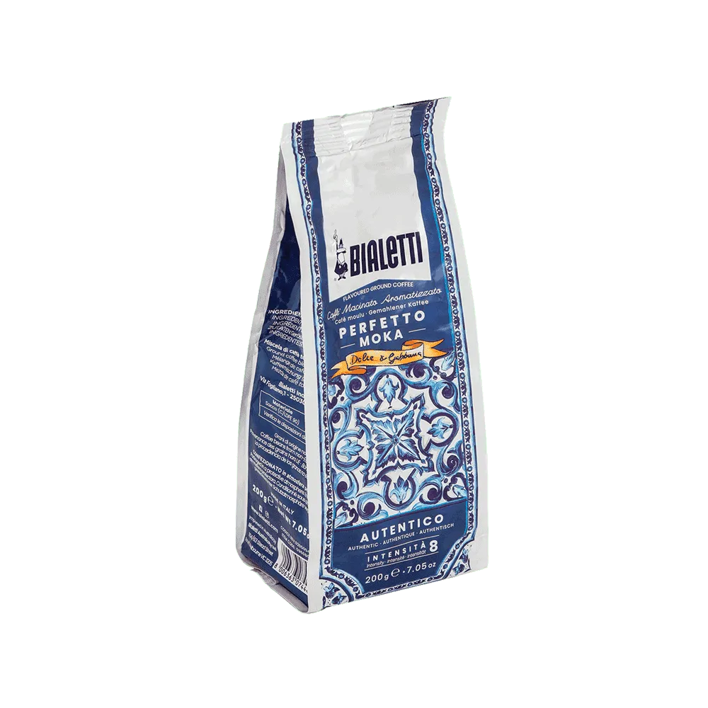 Perfetto Moka Autentico coffee is the result of the encounter between the skilful art of Bialetti’s master coffee roasters and the creative flair of Dolce&Gabbana.