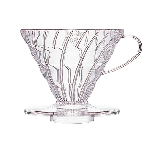 The Hario V60 Dripper 02 Clear Plastic features Hario’s famous 60 degree design, large drip hole, and spiral ridge edges.